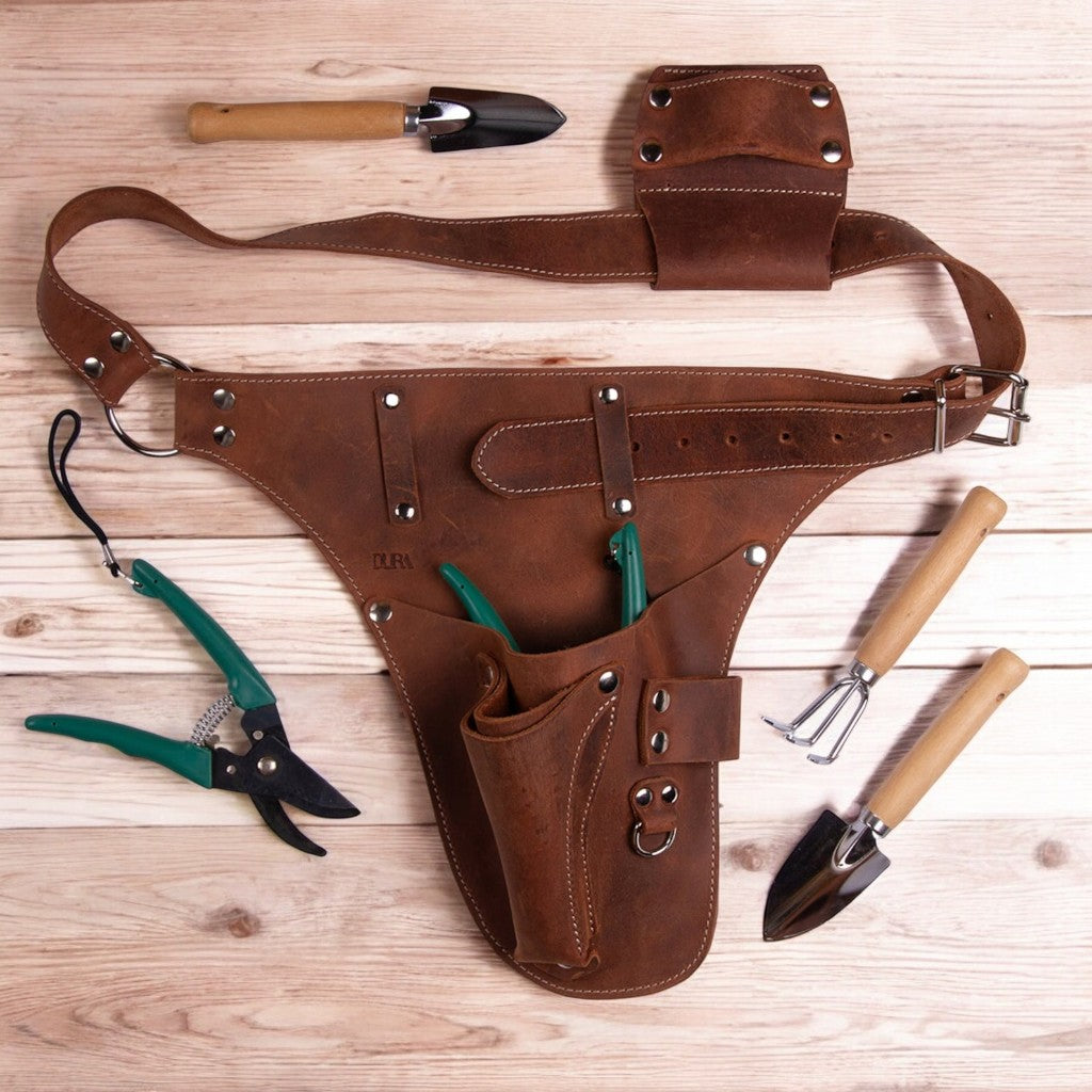 Handcrafted leather gardening belt holster with adjustable fit and tool pouches. Built from full-grain Crazy Horse leather for style, durability, and everyday use.
